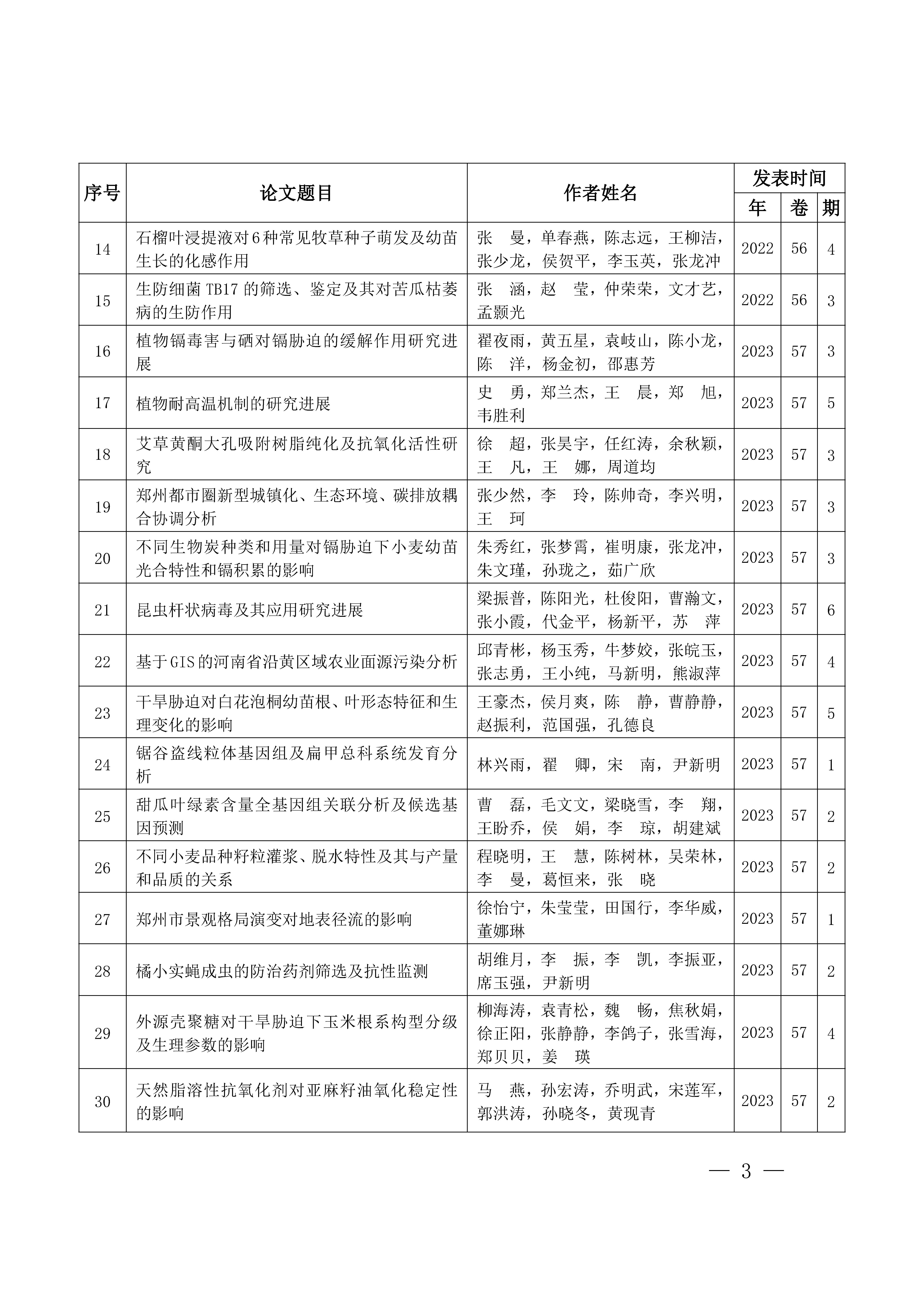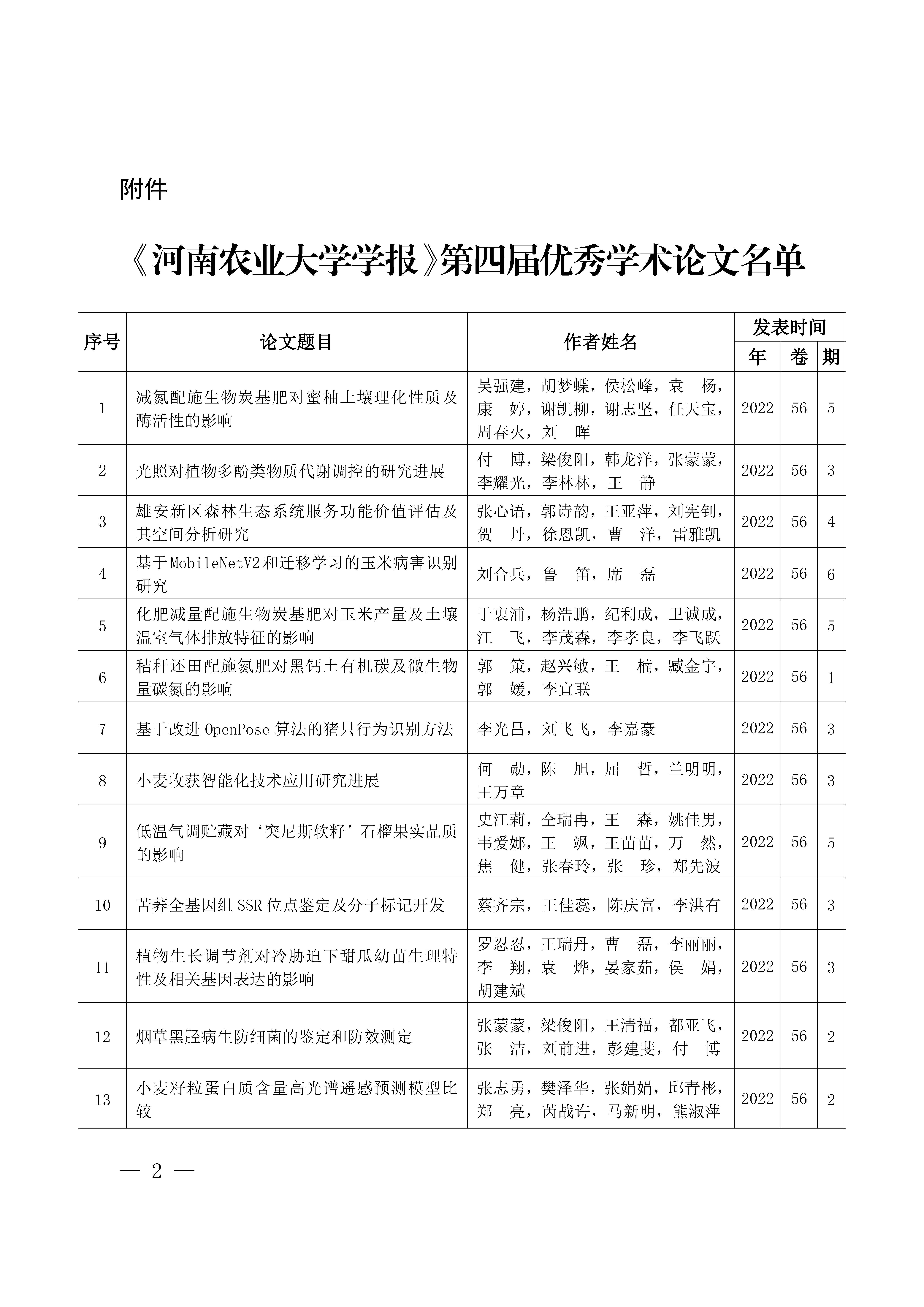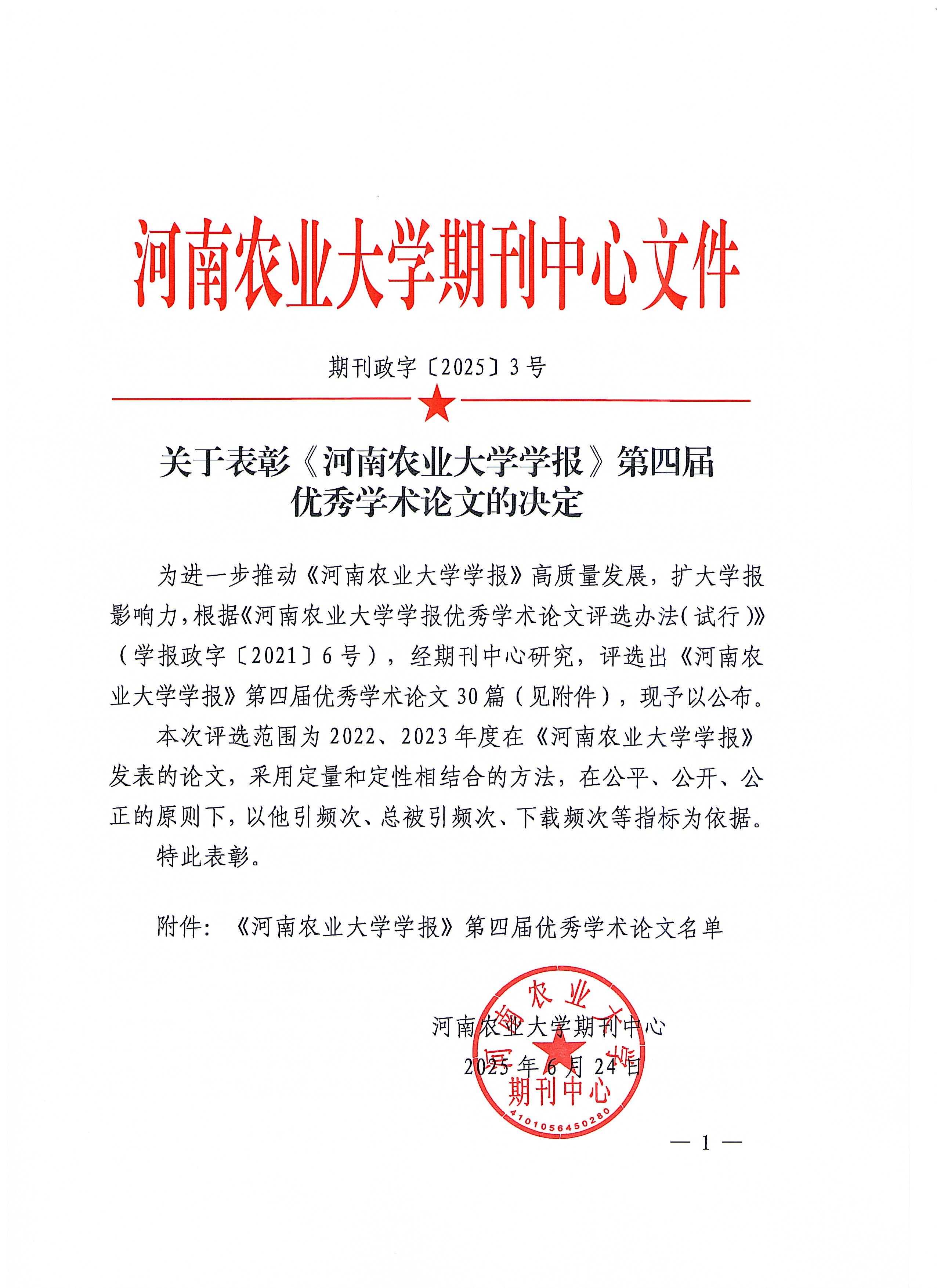 为进一步推动《河南农业大学学报》高质量发展,扩大学报影响力,根据《河南农业大学学报优秀学术论文评选办法(试行)》(学报政字〔2021〕6号),经期刊中心研究,评选出《河南农业大学学报》第四届优秀学术论文30篇,现予以公布,特此表彰。
